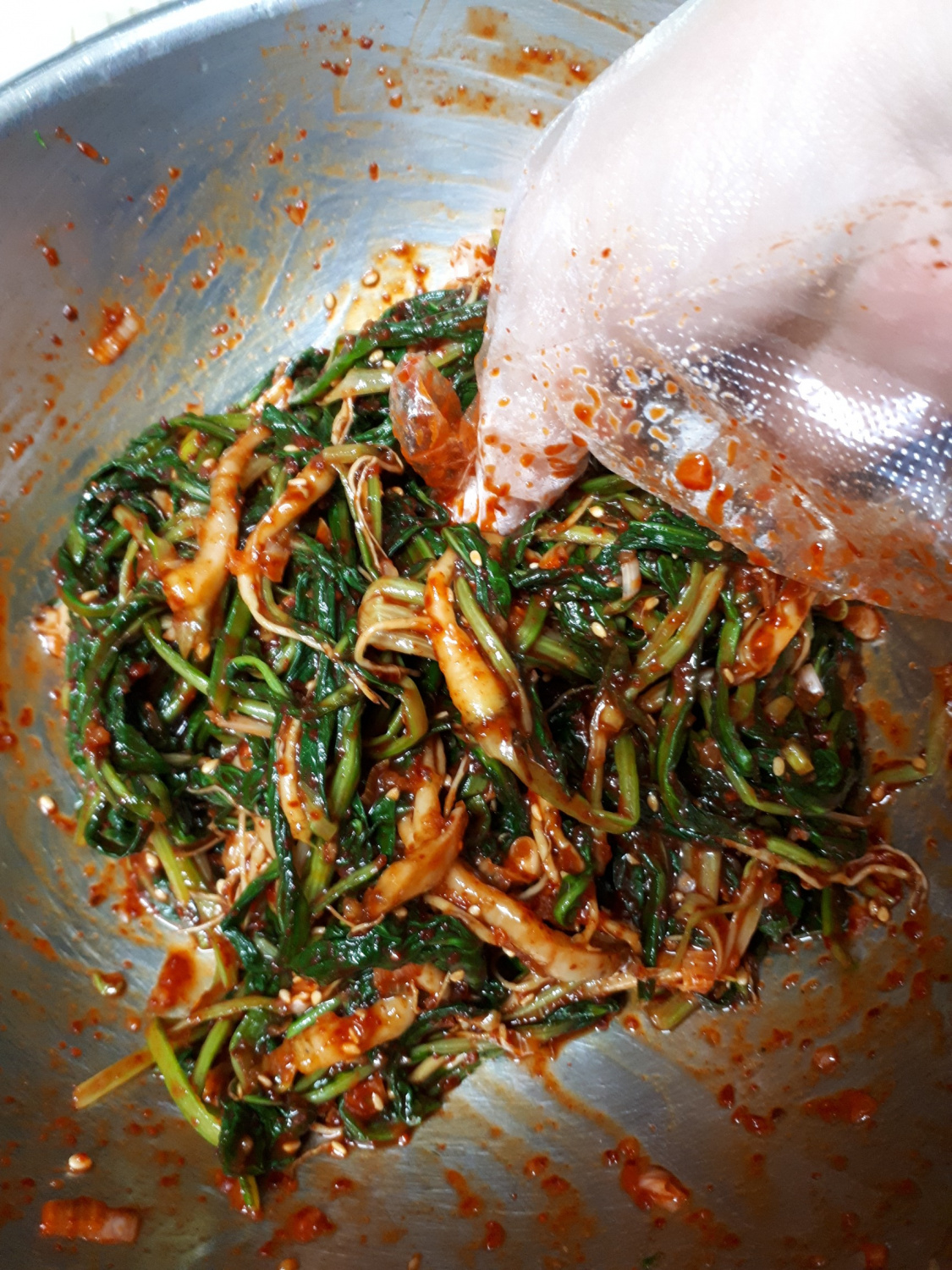 부드럽게 뒤집듯이 양념을 묻혀주세요. - 뿌리 부분과 잎 부분에 양념이 잘 스며들도록 신경 써야 해요.