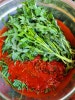 - 큰 볼에 고춧가루 1컵을 넣고 식힌 찹쌀풀을 섞어 고춧가루를 불립니다.